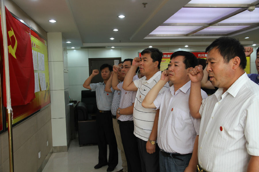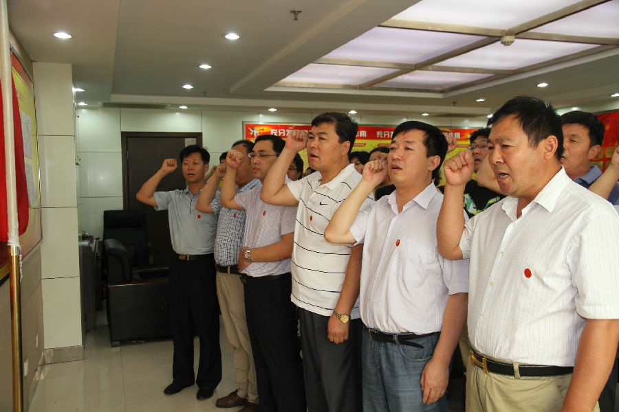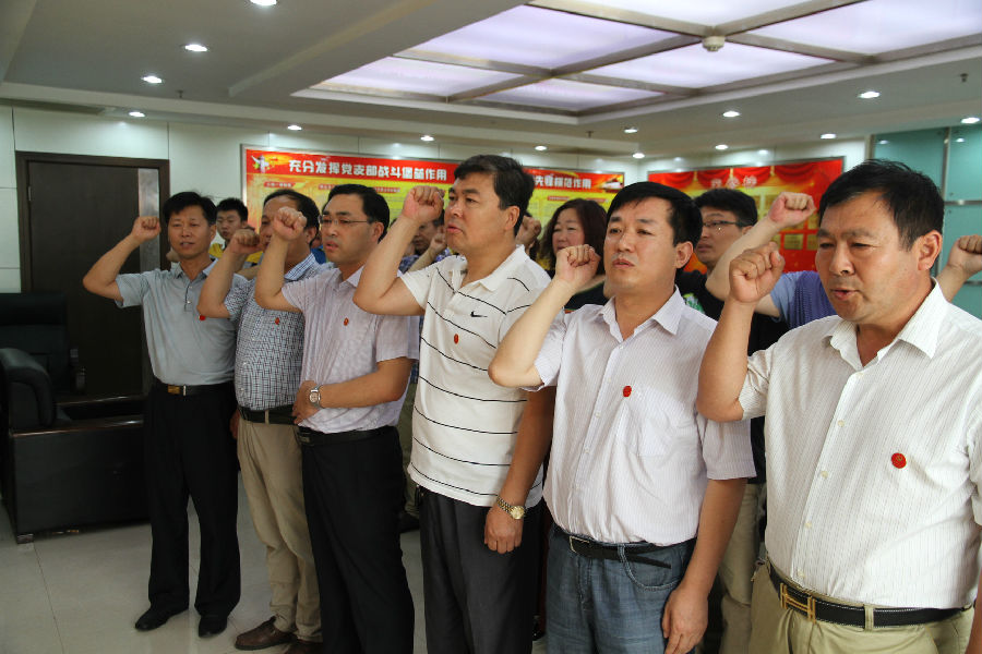 黨課開始之前,由于立東同志提議并領(lǐng)誓,全體黨員佩戴著黨徽,面向黨旗,舉起右手,緊握拳頭,共同重溫了入黨誓詞,作出莊嚴(yán)宣誓。